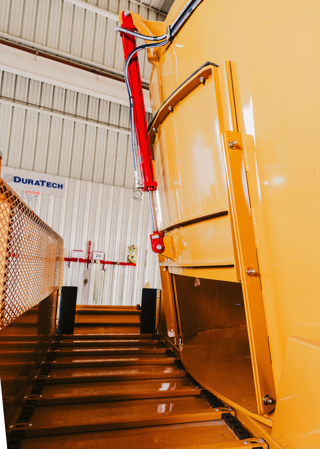 Для контроля процесса предусмотрены смотровые окна с обеих сторон бункера. Большая выгрузочная дверь обеспечивает быструю и равномерную разгрузку, а также упрощает очистку оборудования.