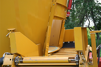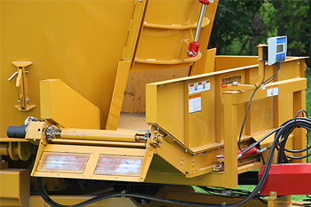Модель оснащена двумя мощными вертикальными шнеками диаметром 76 дюймов с самозатачивающимися ножами, что обеспечивает эффективное измельчение волокнистых материалов и равномерное распределение компонентов в смеси.